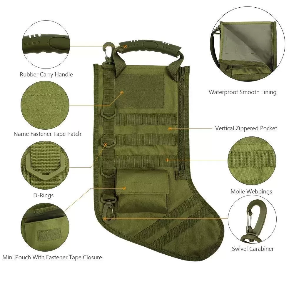The Tactical Christmas Molle stocking comes as a blank slate with no accessory attached to it so you'll have to get creative and also purchase some sweet tools, accessories, and survival gear to fill it with. (Hint: check our Tactical Stuff collection ;)